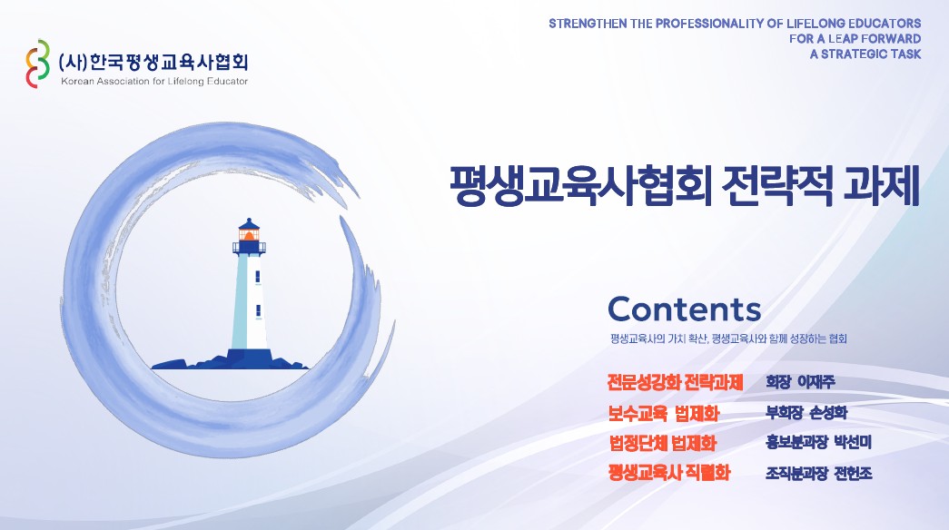 - 협회 법정단체화로 강력한 정책 참여를: 평생교육사의 권익을 대변하고 정책에 목소리를 내야 합니다.