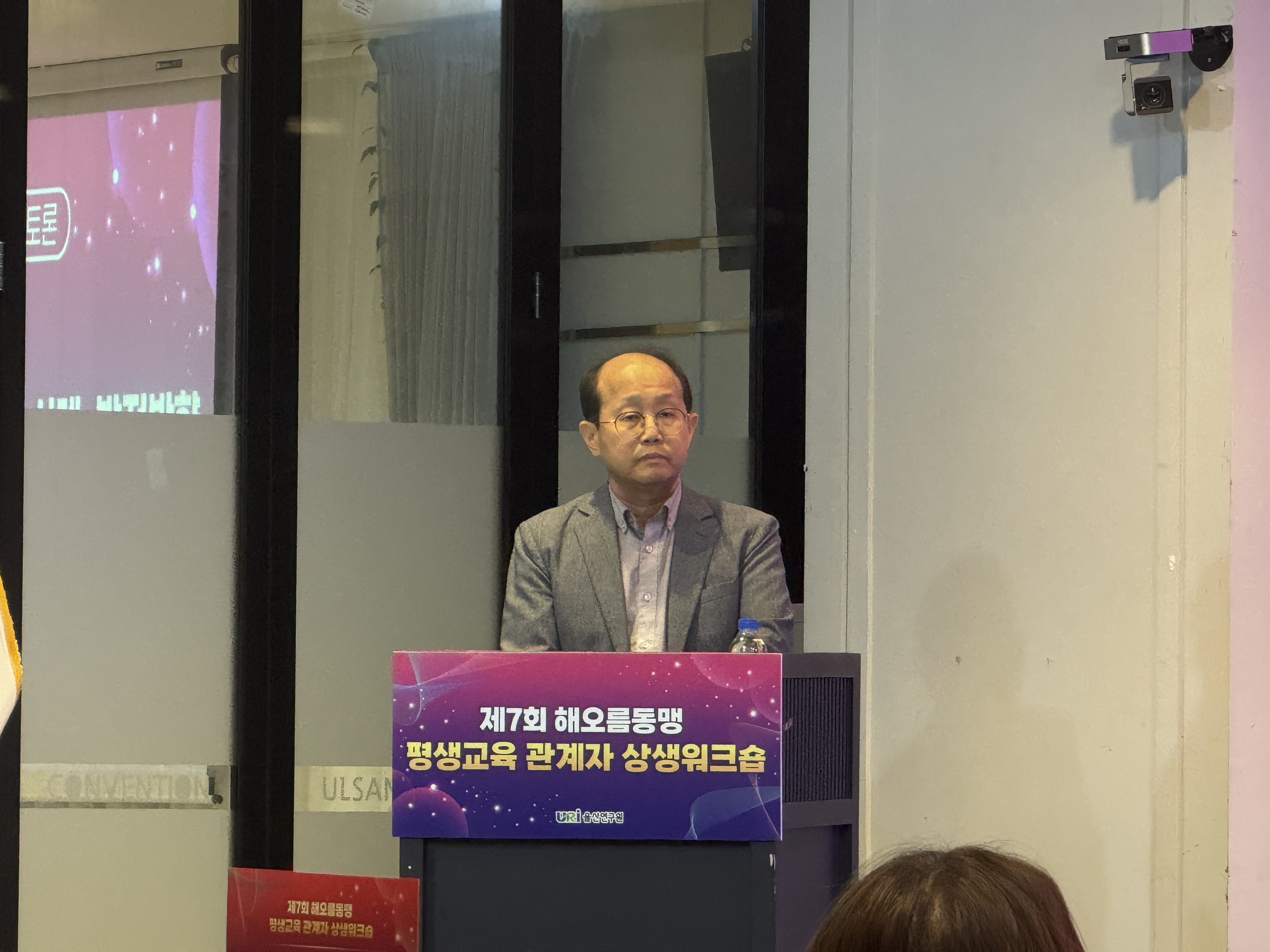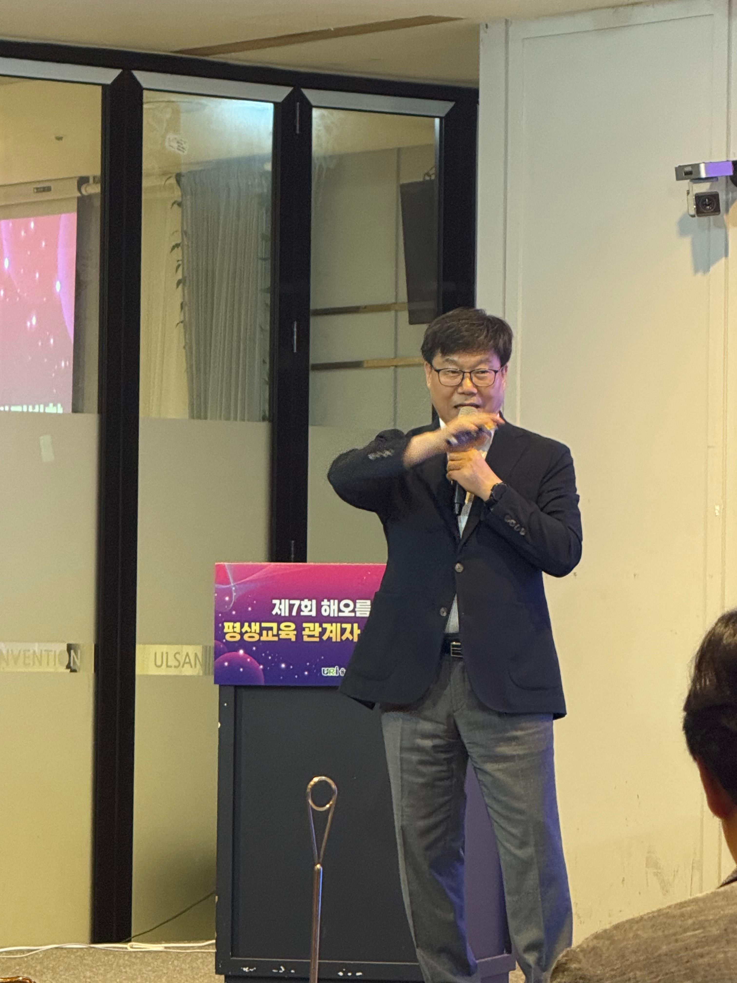 이번 워크숍의 핵심 중 하나는 윤여각 한국방송통신대학교 울산지역대학장님의 기조강연이었습니다. 강연은 '미래사회 대비 지역평생교육 프로그램 개발'이라는 주제로 진행되었는데, 특히 평생교육이 법률상 '프로그램'으로 진행되지 않는 모든 교육을 배제한다는 점과 '지역 평생교육'에 대한 일반적인 오해를 지적하며 강연의 문을 열었습니다. 유네스코의 평생교육 개념 확산 취지에 비추어 볼 때, 평생교육이 특정 영역에만 국한되는 것은 부적절하다는 말씀에 깊이 공감했습니다.